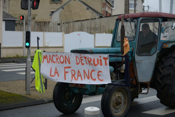 Un vrombissement sourd sort de la carrosserie bleue émaillée d’un petit tracteur sur la place de la République; une banderole « Macron détruit la France » affichée fièrement sur le capot. Les engins agricoles se tiennent prêts à fermer la marche, déjà historique, à Châteauroux mardi 31 janvier.